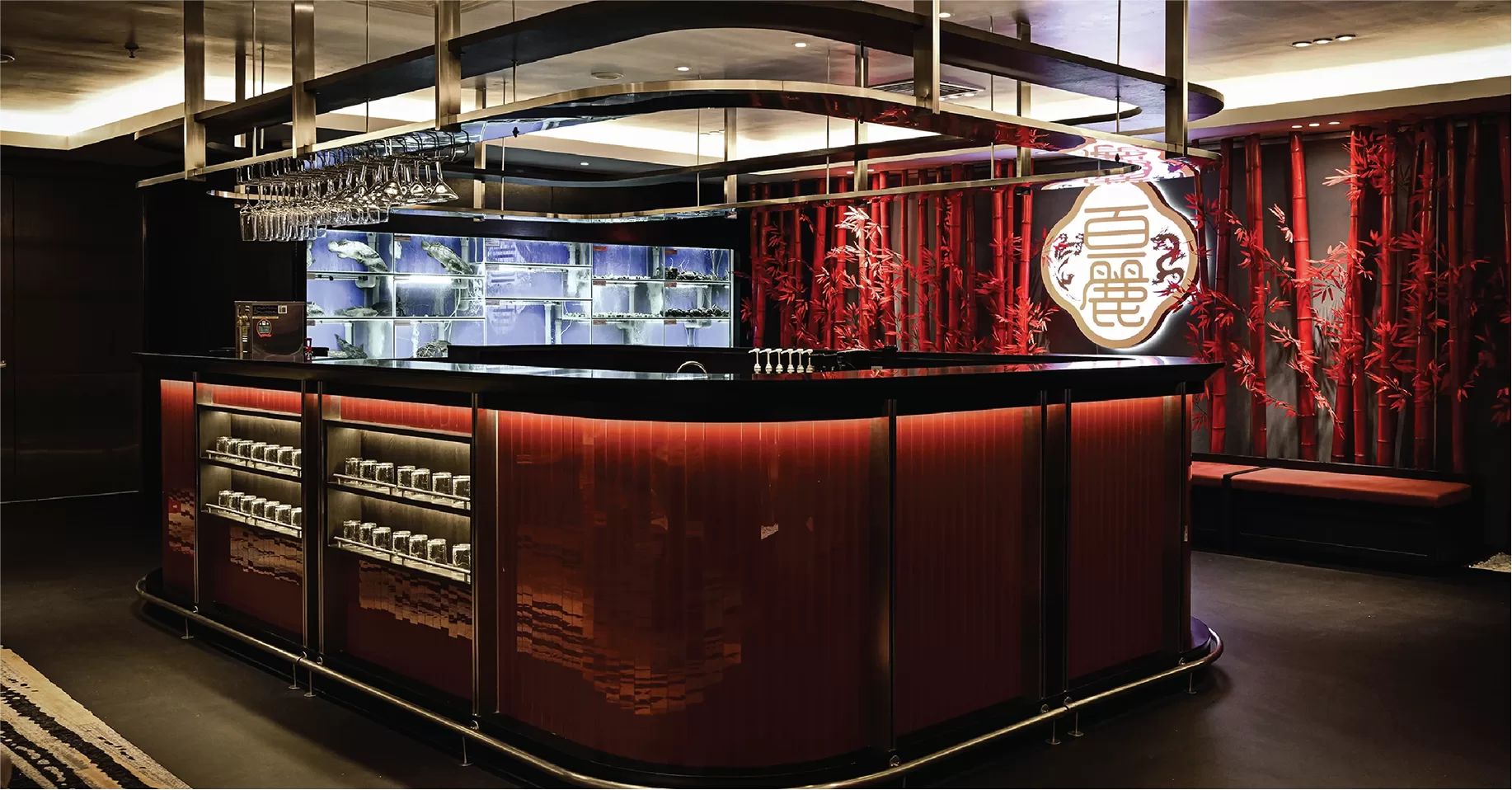 Stepping into the restaurant, the first impression is an exclusive beverage counter, meticulously designed to leave a lasting mark. A burst of red color from the glass catches the eye, creating a vibrant focal point. The hanging stainless steel rack adds a touch of contemporary elegance, while the interplay of black flooring and stainless-steel elements reinforces the restaurant's commitment to exclusivity and sophistication. In the heart of our design lies a profound symbol—the red bamboo. Red, a color traditionally associated with prosperity and good fortune in Chinese culture, breathes life into the bamboo, transforming it into a vibrant emblem of enduring values.