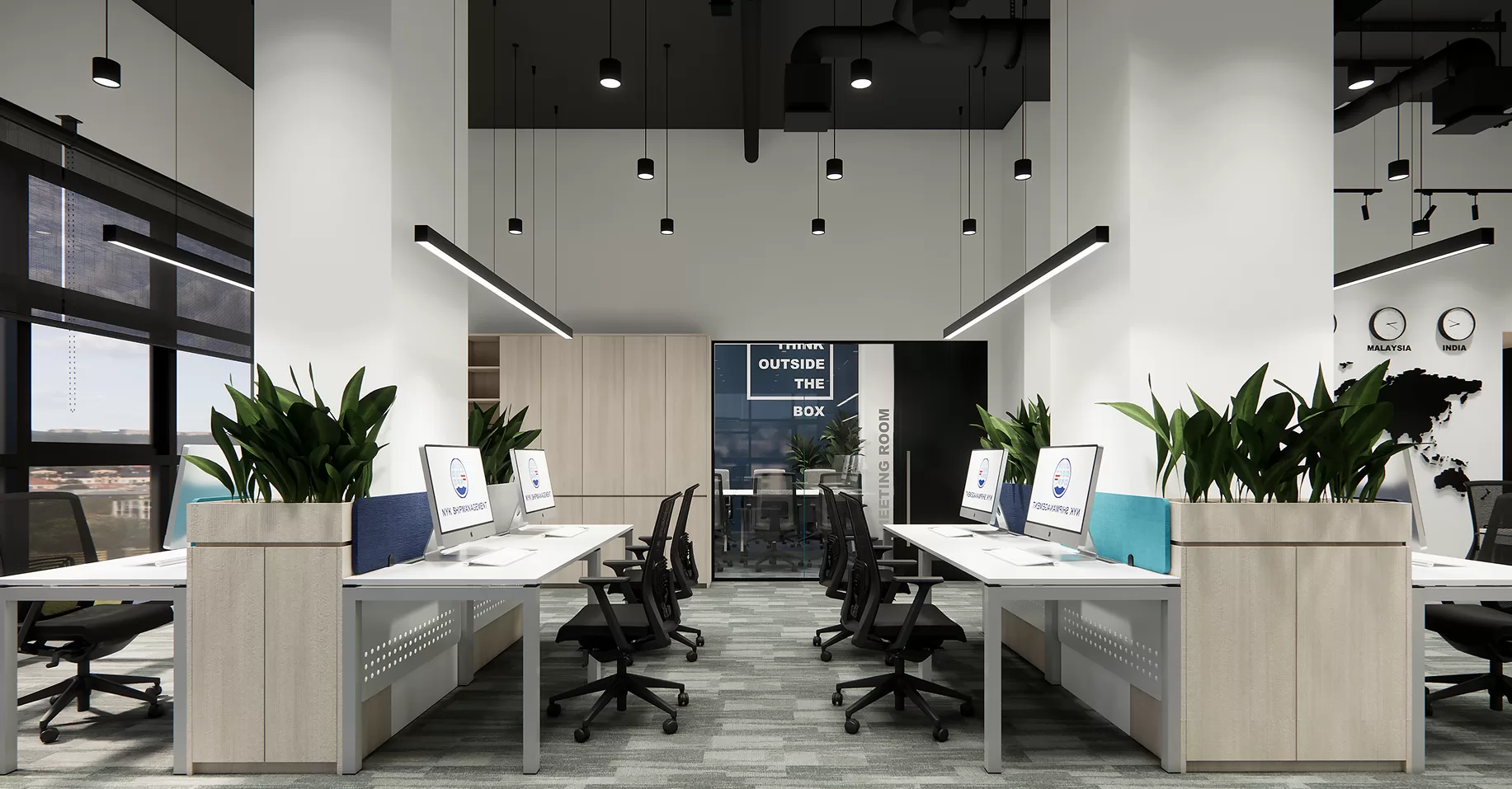 At the core of the office, a central island counter becomes the heart of interaction. It’s a casual yet purposeful hub where conversations flow as easily as ideas — mirroring the spirit of open communication that keeps maritime operations seamless. Above, linear lighting and exposed ceiling details give the space a dynamic, industrial edge, while potted greens add softness and balance.