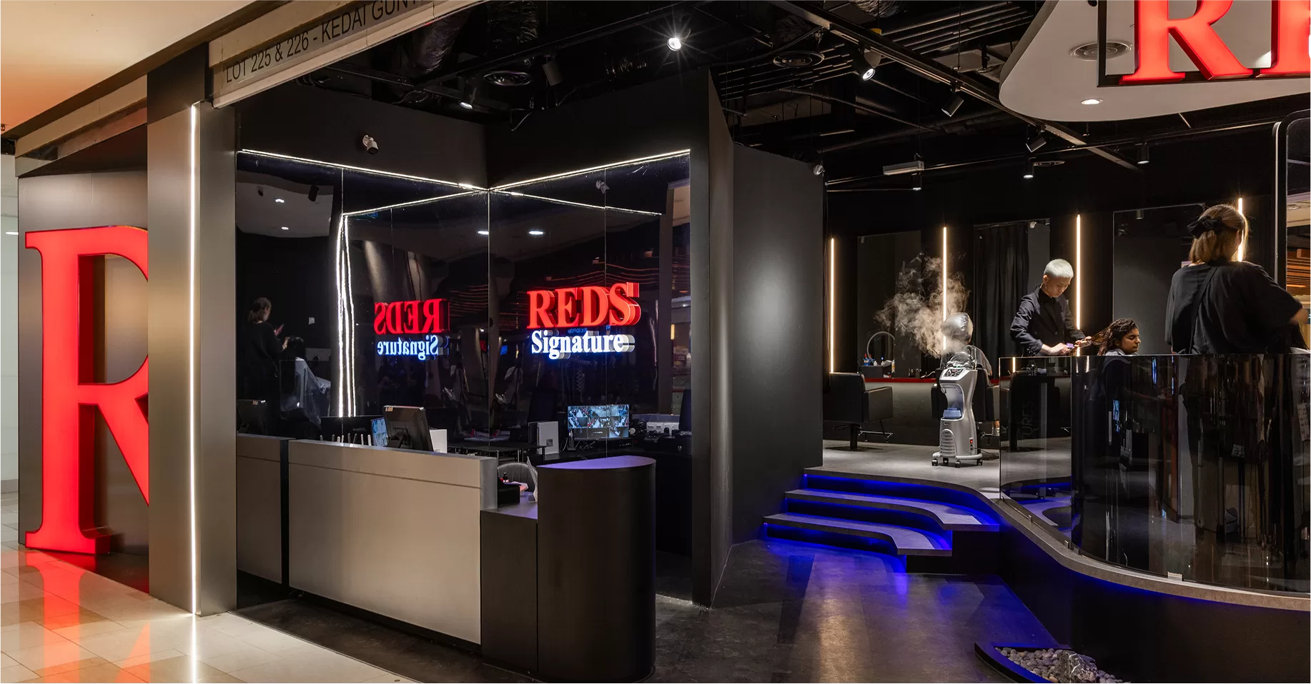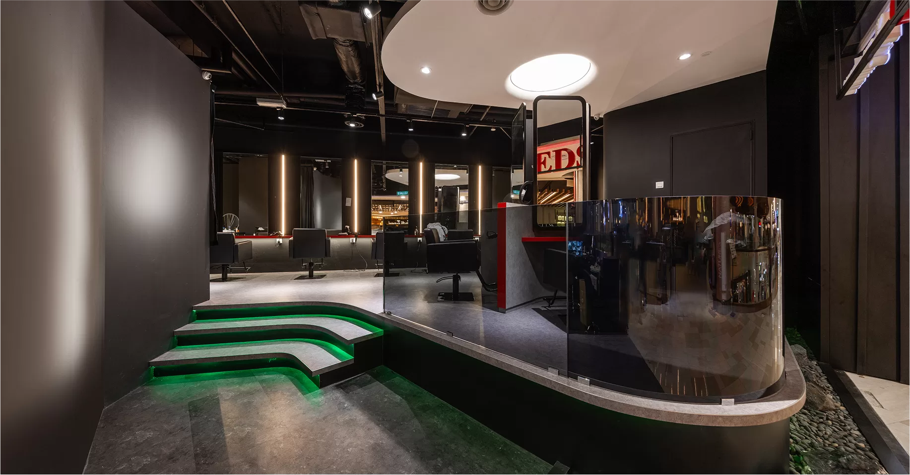 This isn’t just a typical salon. The design brings out REDS’ bold, fashion-forward identity with clean lines, layered textures, and glossy finishes that add a touch of elegance and professionalism. Every detail, from smooth surfaces to simple forms, is thoughtfully chosen—just like the art of cutting and styling hair. To bring the concept to life, platform flooring defines key areas, while clean-cut furniture adds structure and comfort. Glossy materials brighten the space and enhance its polished feel. All finishes are selected for durability, easy maintenance, and visual appeal—perfect for a busy salon.