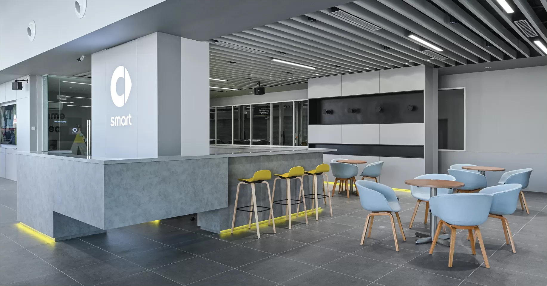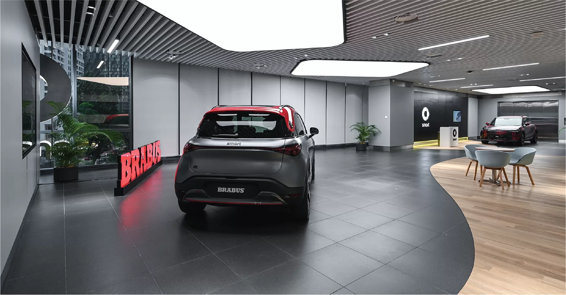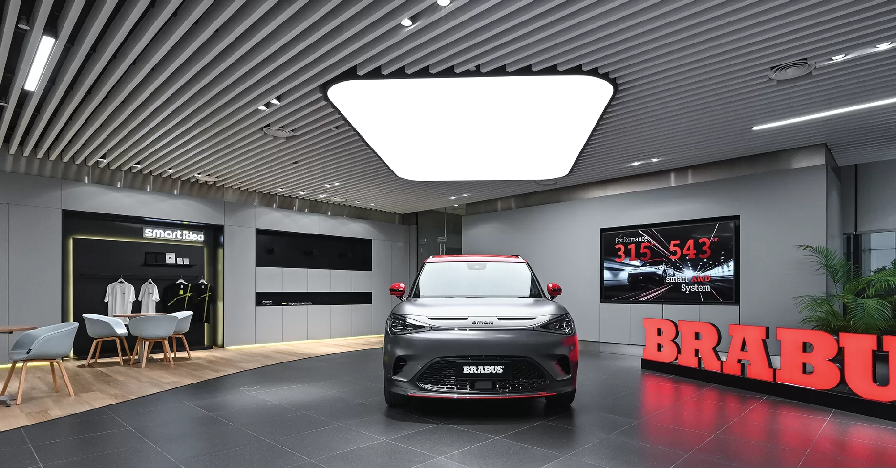 A feature wall comes to life with the vibrant glow of lime green LED lights. This isn't just illumination; it's a statement. The lime green accents serve as a bold and distinctive identity for the Smart Electric Car brand, making a lasting impression on every visitor.