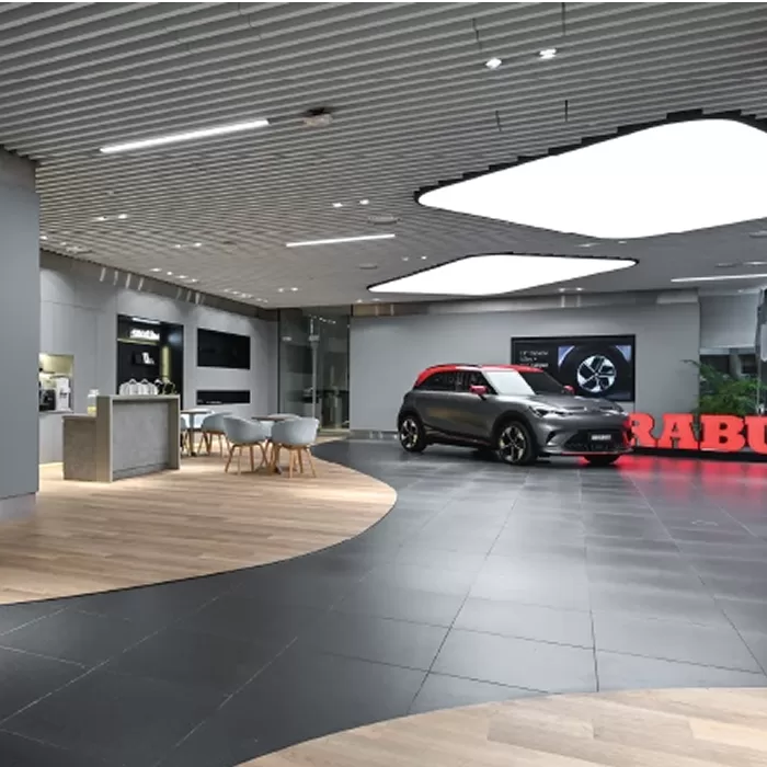 The color scheme chosen for this showroom is a symphony of modernity and elegance. Sleek black flooring and walls, contrasting with warm wood flooring, create a dynamic and inviting atmosphere. The ceiling is adorned with membrane lights strategically placed to enhance the contours and features of the electric car models. The play of light creates a visual feast, guiding visitors through a journey of discovery and admiration.
